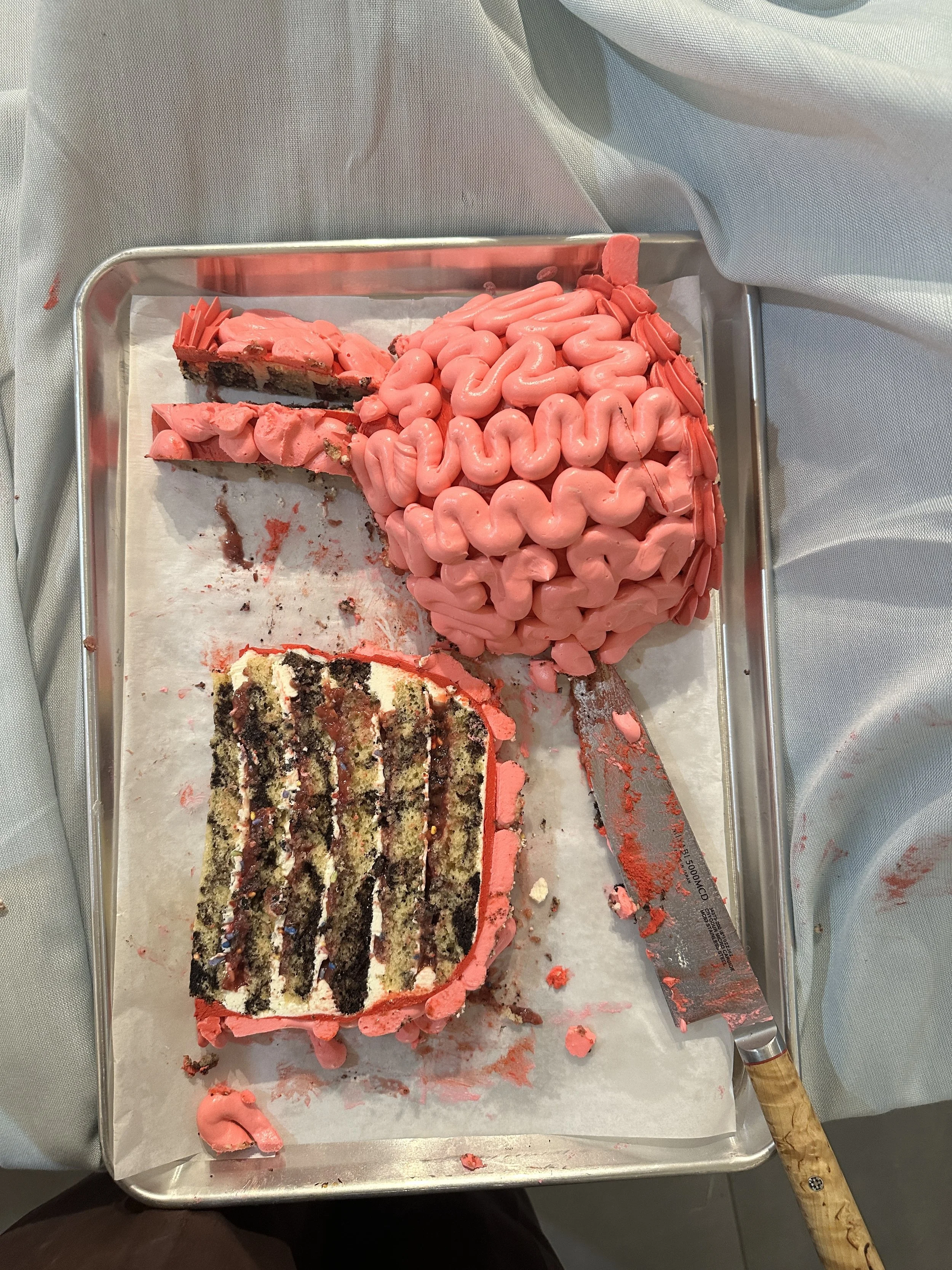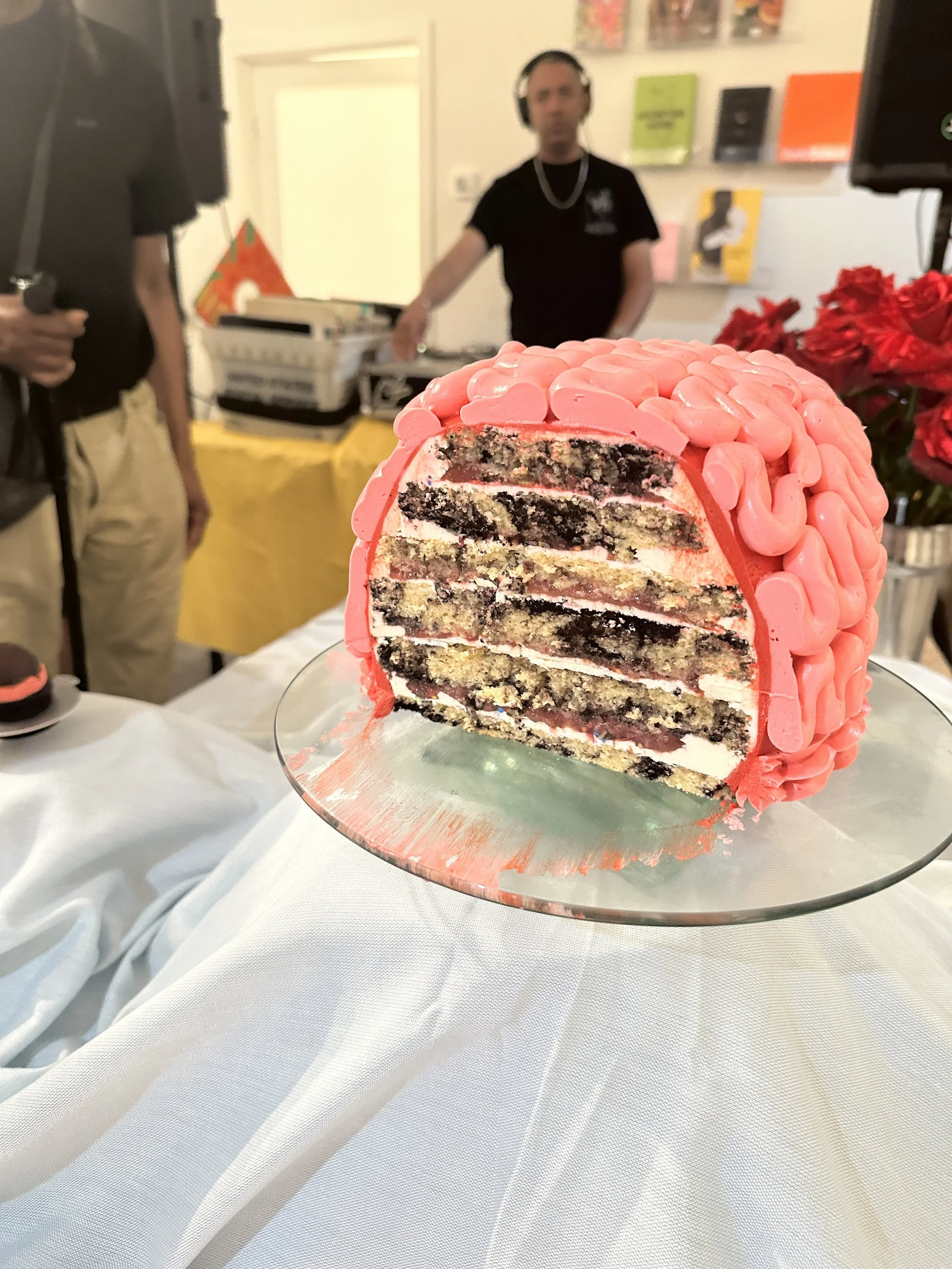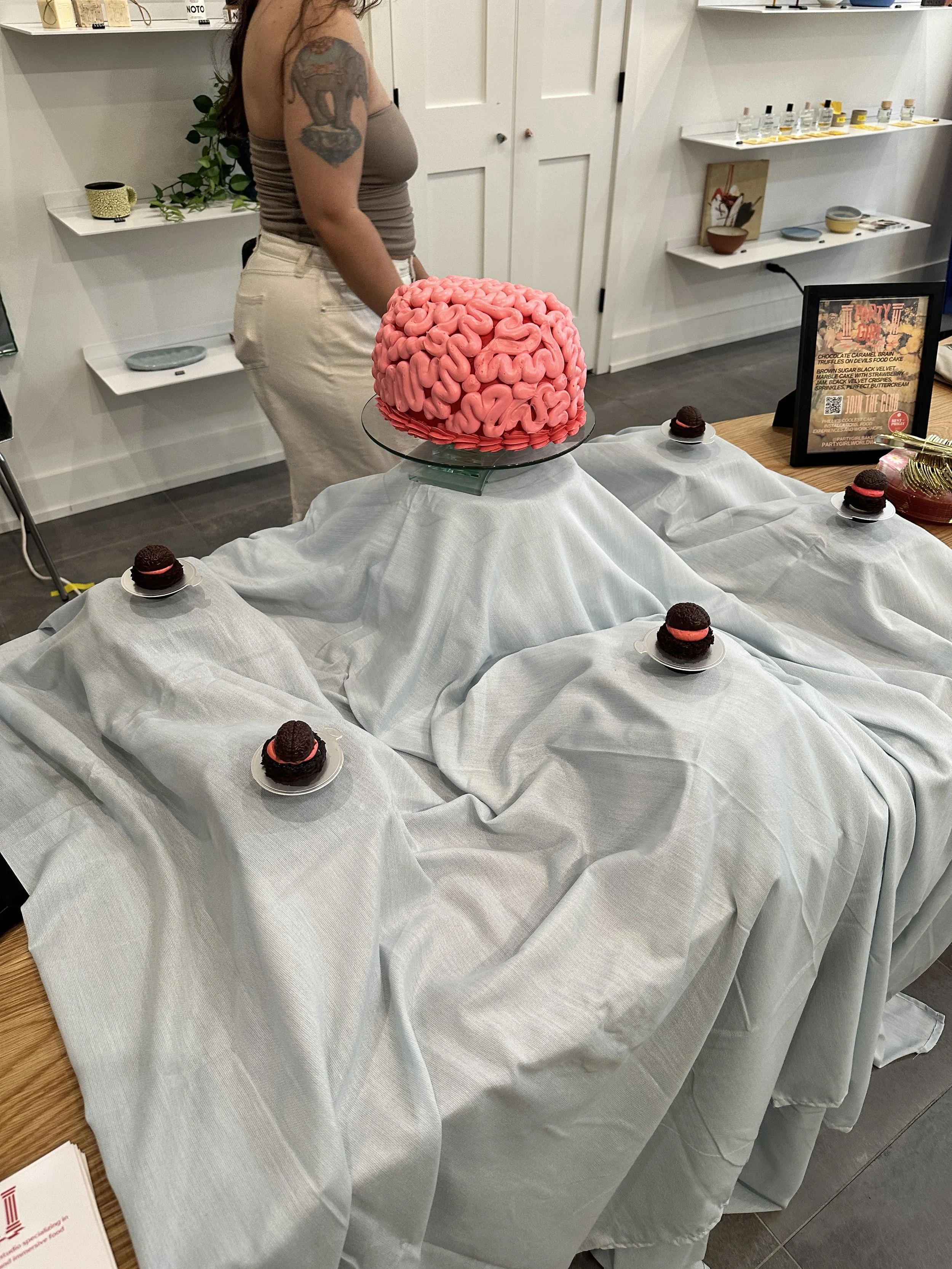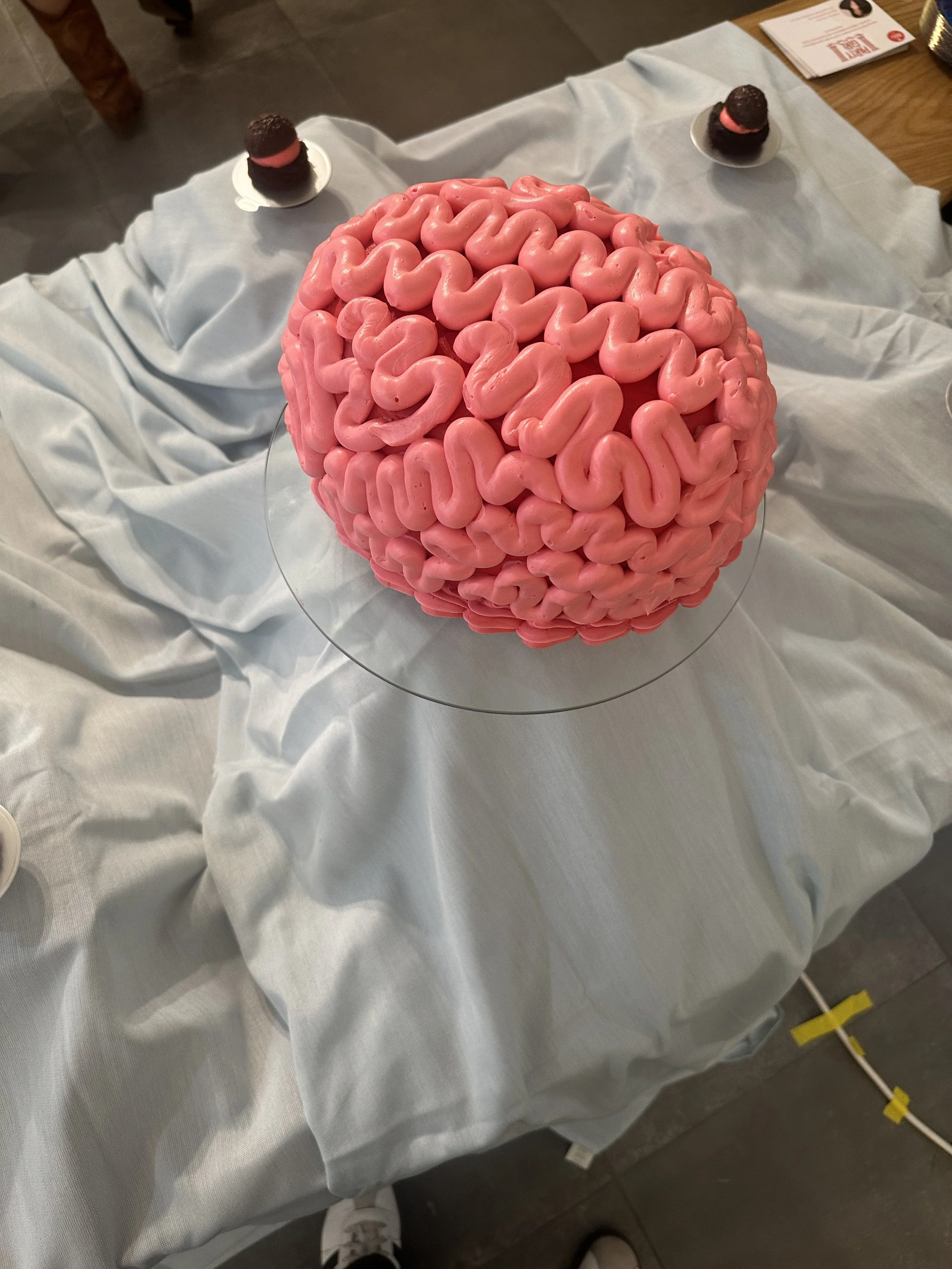 riffing off of the bombardment logo we created a brain cake as the centerpiece surrounded by floating brain truffles filled with salty caramel and chocolate ganache